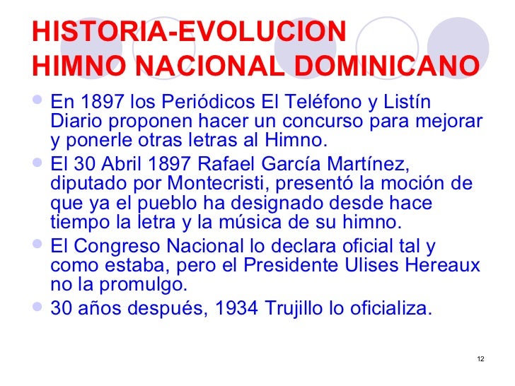 - En 1897 los Periódicos El Teléfono y Listín Diario proponen hacer un concurso para mejorar y ponerle otras letras al Himno.