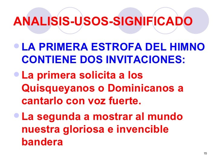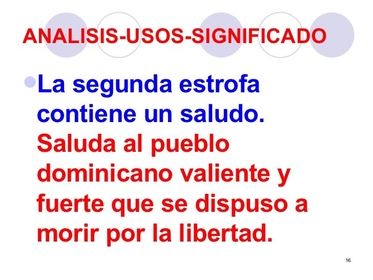 - La segunda estrofa contiene un saludo. Saluda al pueblo dominicano valiente y fuerte que se dispuso a morir por la libertad.
